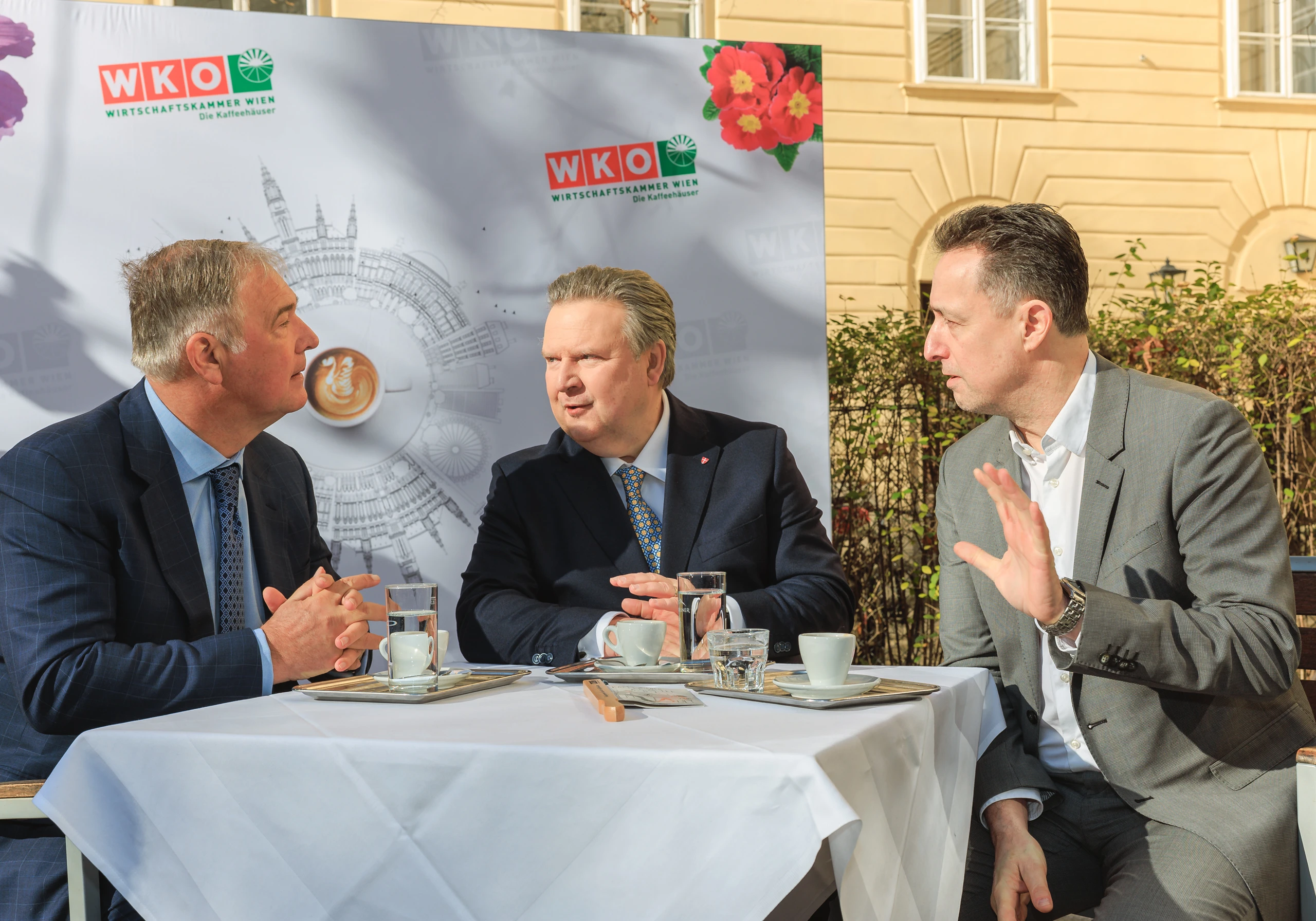 Michael Ludwig, Bürgermeister der Stadt Wien, Walter Ruck, Präsident der Wirtschaftskammer Wien, und Wolfgang Binder, Fachgruppenobmann der Kaffeehäuser Wien, luden zum Frühlingserwachen der Schanigärten ins Café Diglas ein.
